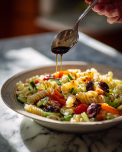 Olive oil creates the base of the dressing. A mild extra-virgin olive oil offers smooth richness that coats the pasta and ingredients without overpowering the dish.