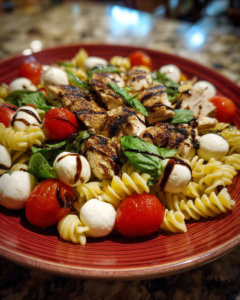 Chicken Caprese Pasta Salad brings together Italian caprese flavor with hearty pasta and tender chicken. Juicy tomato, creamy mozzarella, fragrant basil, and a light balsamic touch create a refreshing dish that feels both satisfying and bright.