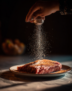 Mix salt (¼ cup / 60 g), black pepper (¼ cup / 60 g), garlic powder (1 tablespoon / 8 g), and smoked paprika (1 tablespoon / 8 g).