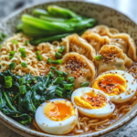 Inspired by the warmth of Japanese-style ramen shops and the practicality of home cooking, this recipe blends convenience with depth of flavor. Savory dumplings simmer gently in a fragrant broth, while soft boiled eggs add creamy richness. Fresh greens provide balance and brightness. The result is a bowl that feels restaurant-worthy yet simple enough to make in your own kitchen.