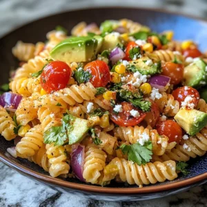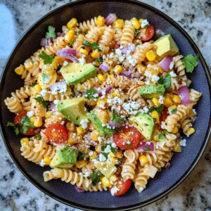 In this pasta salad, those same elements are blended with tender pasta and crisp vegetables. The smoky char from the corn pairs beautifully with the creamy, citrus-forward dressing, while spices add depth and warmth.