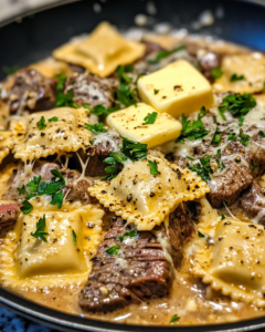 Inspired by the comforting elegance of Italian-American favorites and the hearty satisfaction of steakhouse classics, this dish brings tender seared steak together with pillowy cheese ravioli, all coated in luscious garlic butter. One pan, bold flavor, minimal cleanup—this is true weeknight magic.