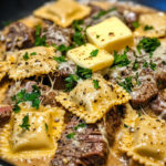 Inspired by the comforting elegance of Italian-American favorites and the hearty satisfaction of steakhouse classics, this dish brings tender seared steak together with pillowy cheese ravioli, all coated in luscious garlic butter. One pan, bold flavor, minimal cleanup—this is true weeknight magic.