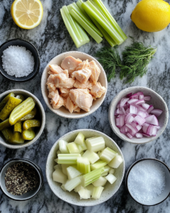 Every ingredient plays a role: the chicken provides hearty protein, pickles add tang, celery contributes crunch, and fresh dill enhances the signature flavor.